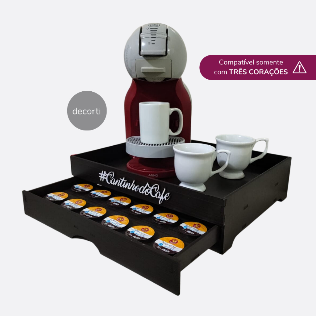 Bandeja Cantinho Do Café Porta-Cápsulas Gaveta Três Corações Marrom MDF Resistente Porta Cafeteira Café da Manhã
