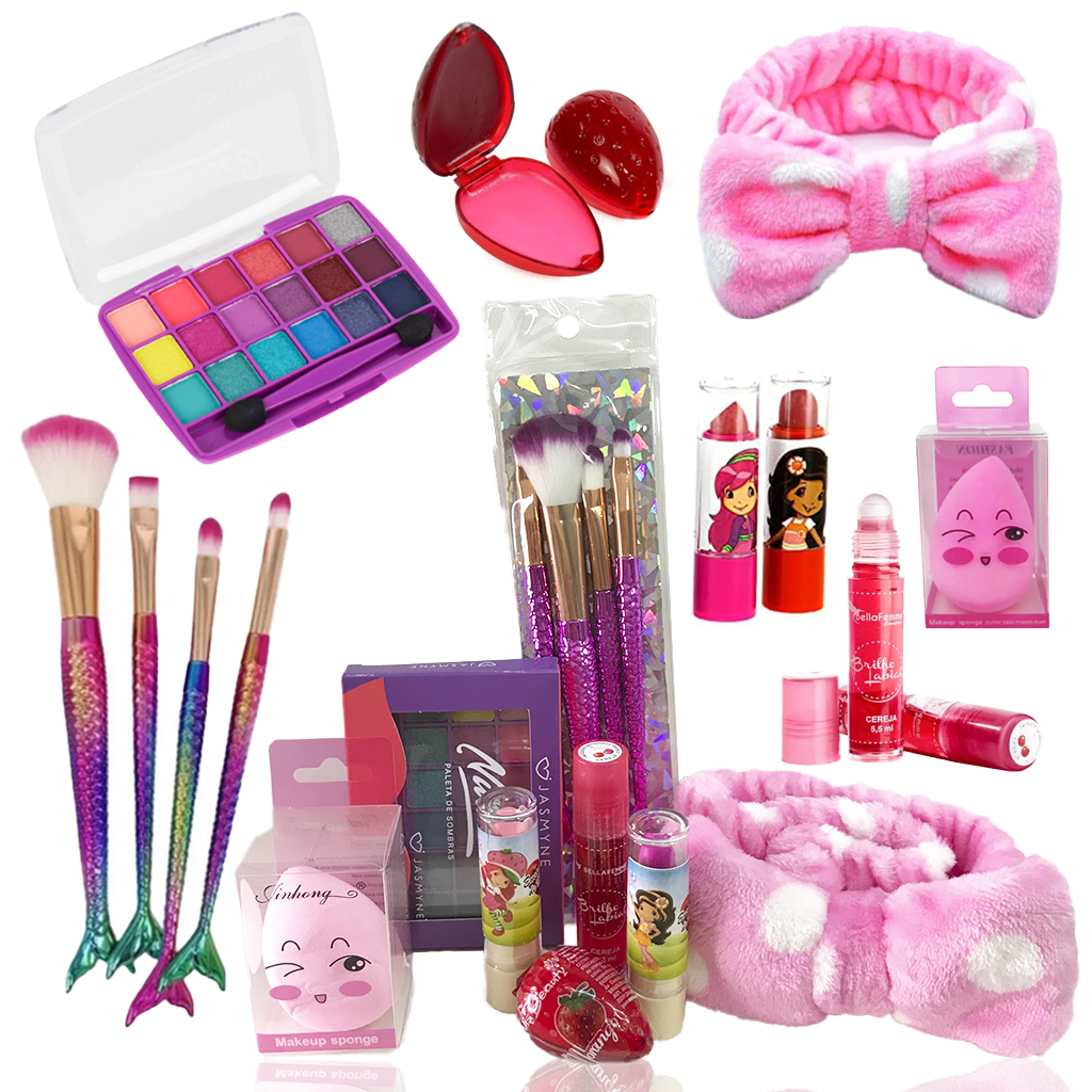 Kit de Maquiagem Infantil Com Batom Brilho Gloss Morango Pincel Sereia Esponja Faixa de Cabelo e Sombra