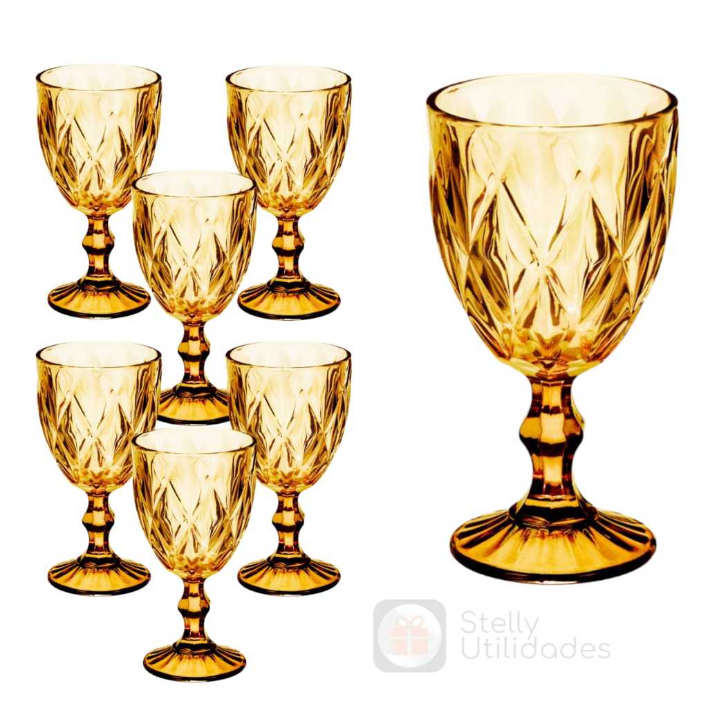 Jogo de 6 Taças de Vidro Diamond Transparente Ambar Furta Cor Bico De Jaca 340ml