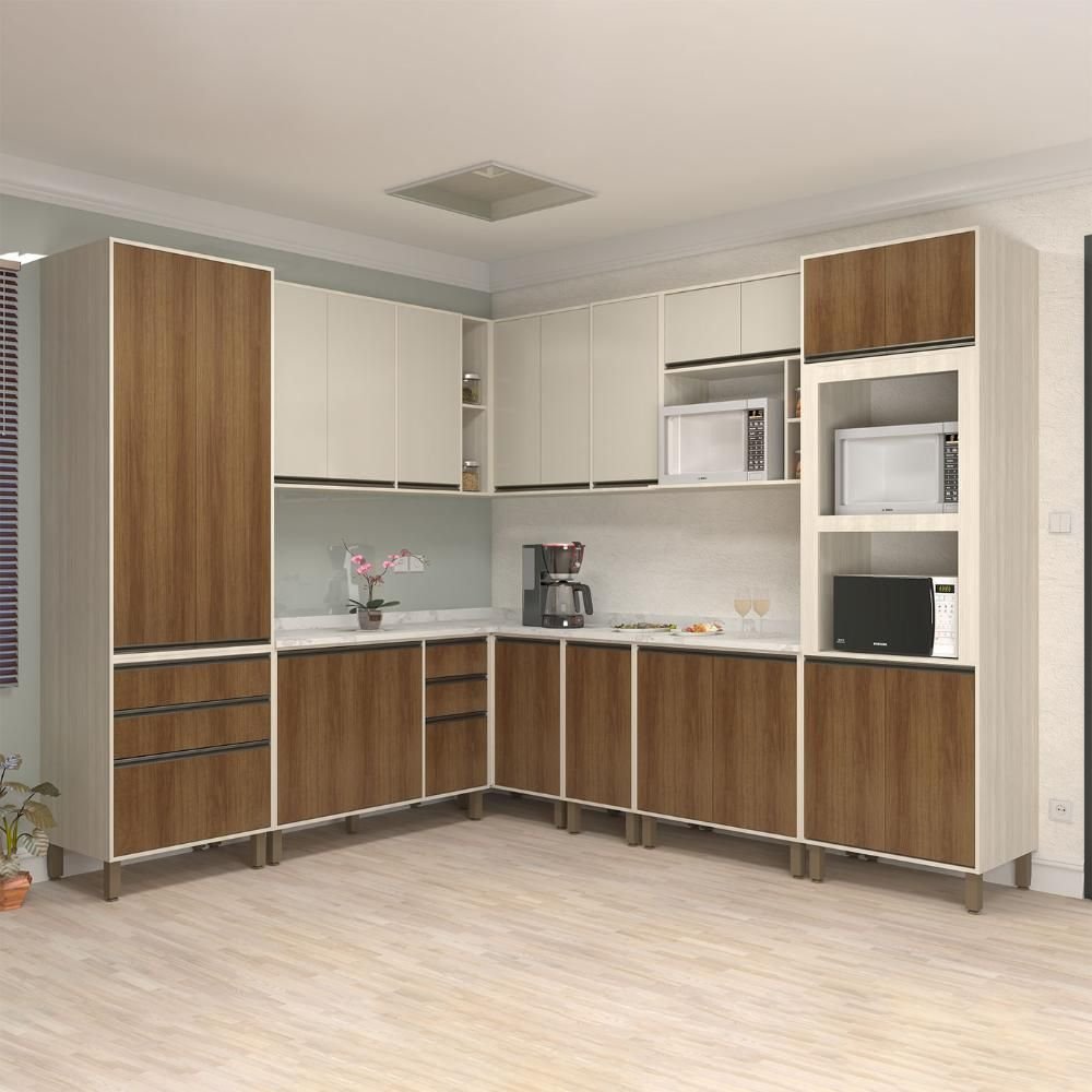 Armário de Cozinha Modulada Linea 538cm Torre Quente Nichos Cor:avelã com Mocca Laca