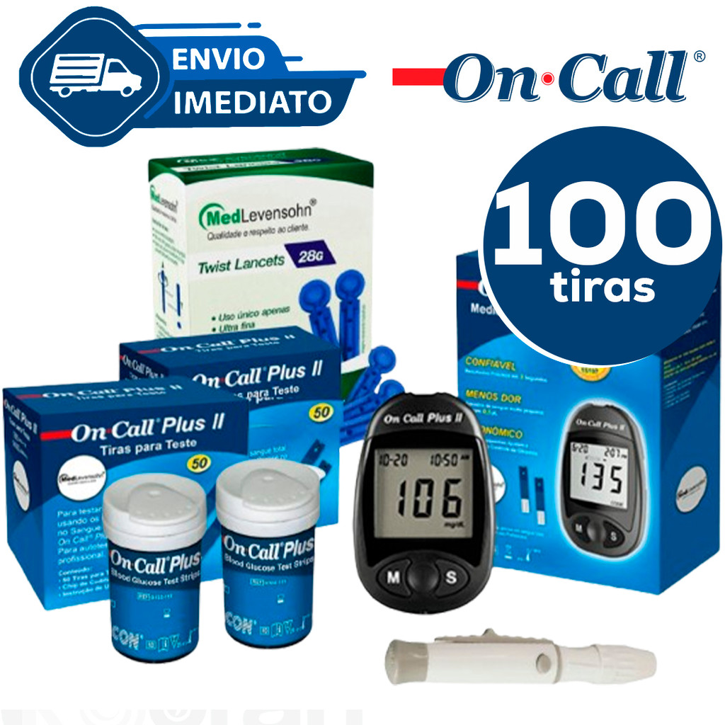 Kit C/ Medidor + 100 Tiras de Glicemia + 100 Lancetas + Caneta On Call Plus 2 Glicose Envio Imediato