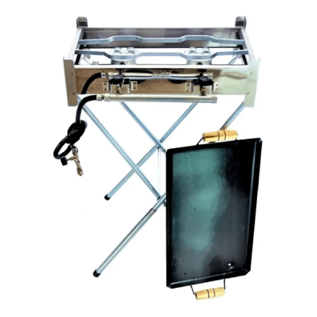 Fogão Inox Fogareiro Industrial A Gás 2 Bocas Com Chapa E Pés Desmontável + Kit Gás Incluso