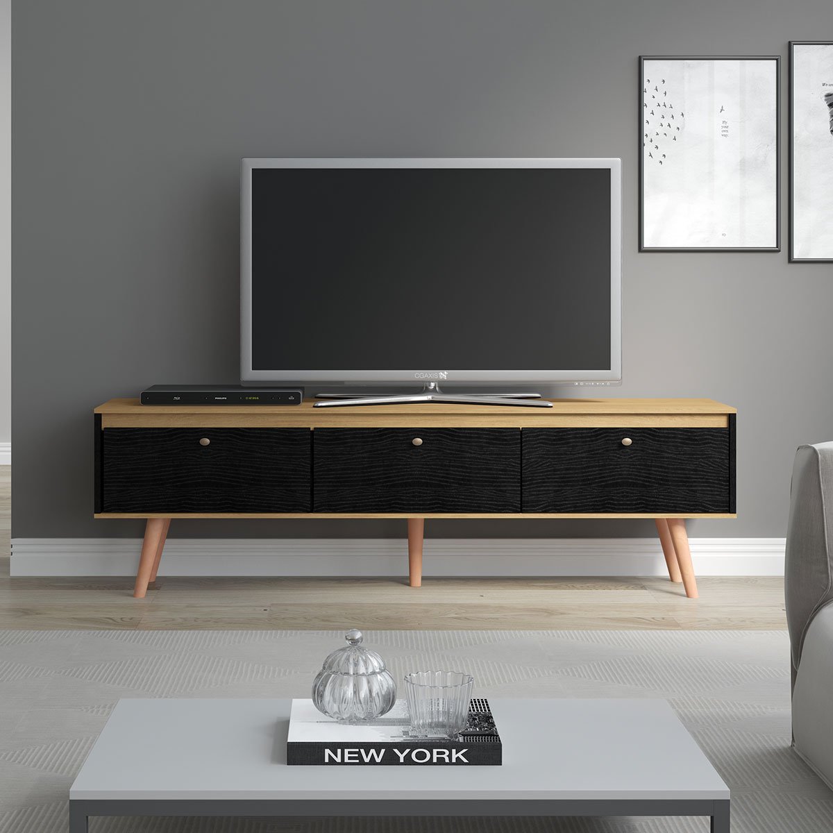 Rack Grande Retrô para Tv 65 Pol. com 3 Portas 160 X 59 Cm Memphis Mdp Preto 0673 Menu