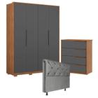 Guarda Roupa Attore 4 Portas com Pés e Cômoda Atria Amêndola Grafito com Cabeceira Daiana 140 cm Cinza Demartêz