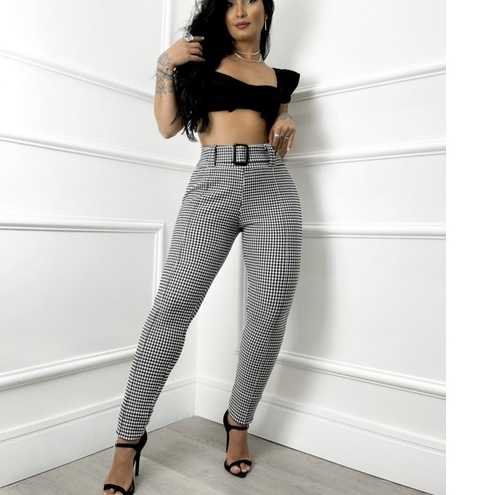 Calça Feminina Legging Skinny Xadrez Crepe Com Cinto e Bolsos Moda Blogueira