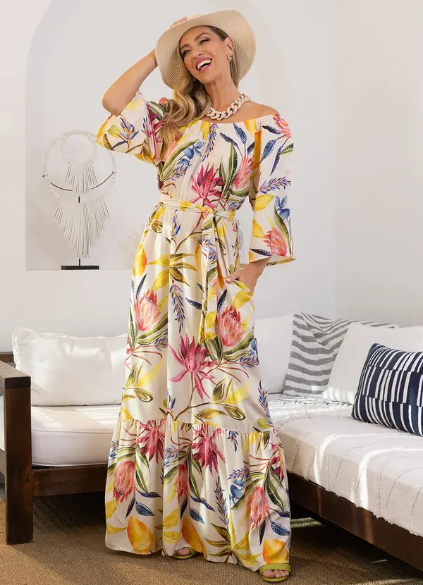 Quintess - Vestido Longo Floral Line em Viscose Plana