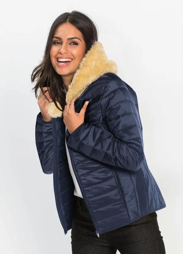 bonprix - Jaqueta Matelasse com Pelos no CapuzAzul Marinho
