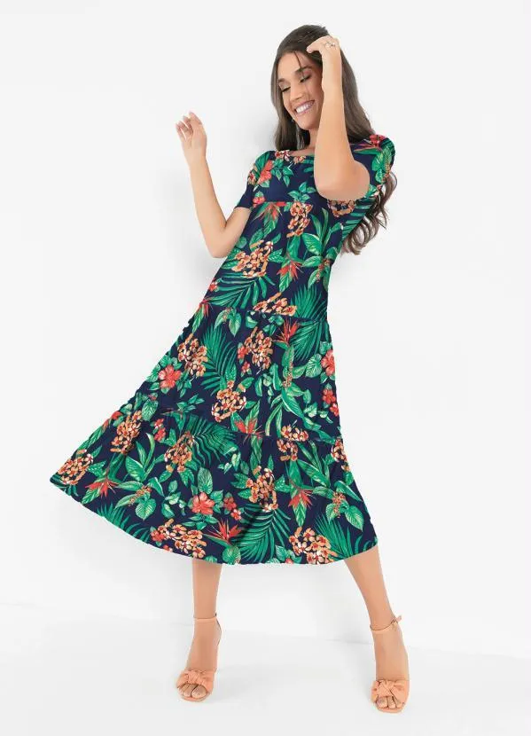 Moda Pop - Vestido Floral Marinho com Recorte em Camadas