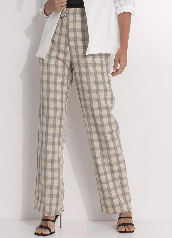 Quintess - Calça Xadrez Bege em Alfaiataria