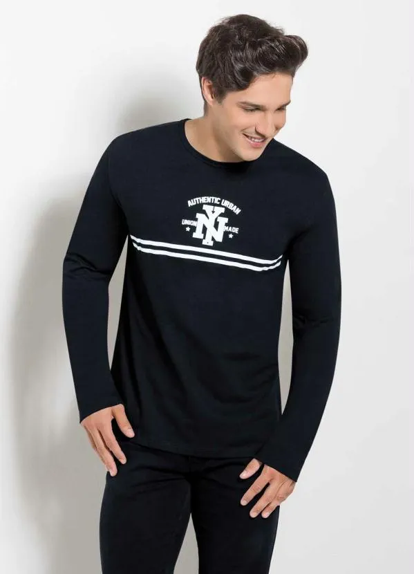 Moda Pop - Camiseta Preta com Manga Longa e Estampa Ny