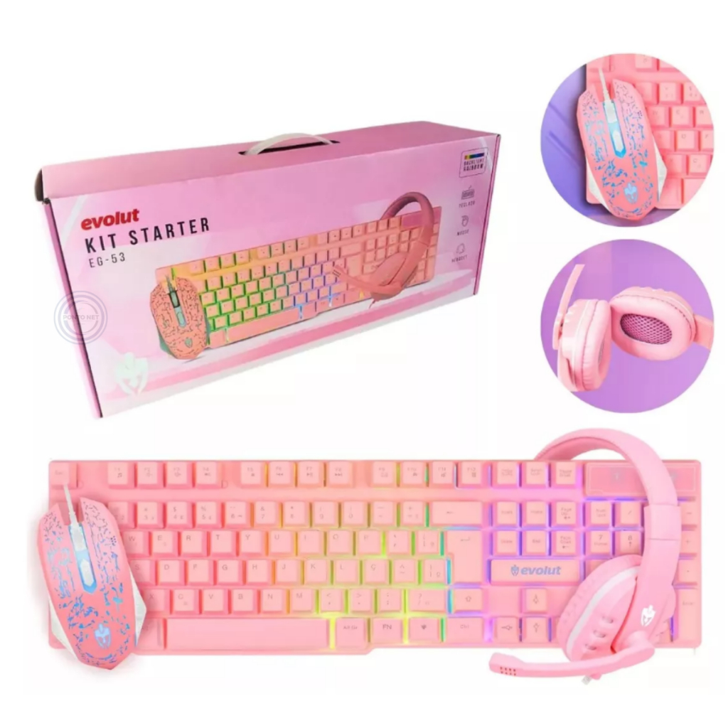 Kit Gamer Evolut Eg53 Semi Mecânico Teclado Mouse E Headset Rosa Barbie