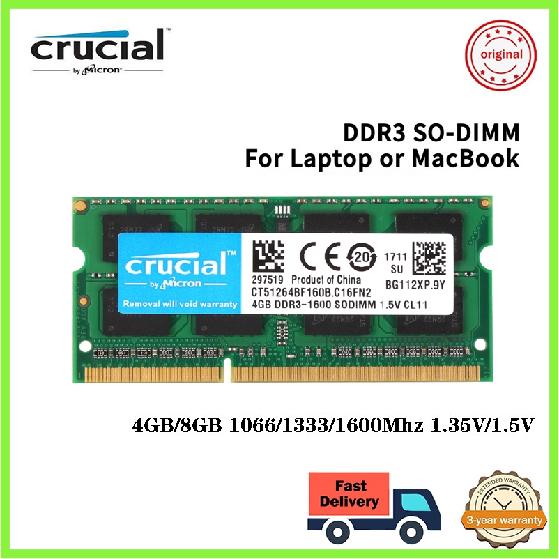 Memória Crucial DDR3 DDR3L 4GB 8GB 1066MHZ 1333MHZ 1600MHZ 1.5V 1.35V SO-DIMM RAM Para Notebook Portátil