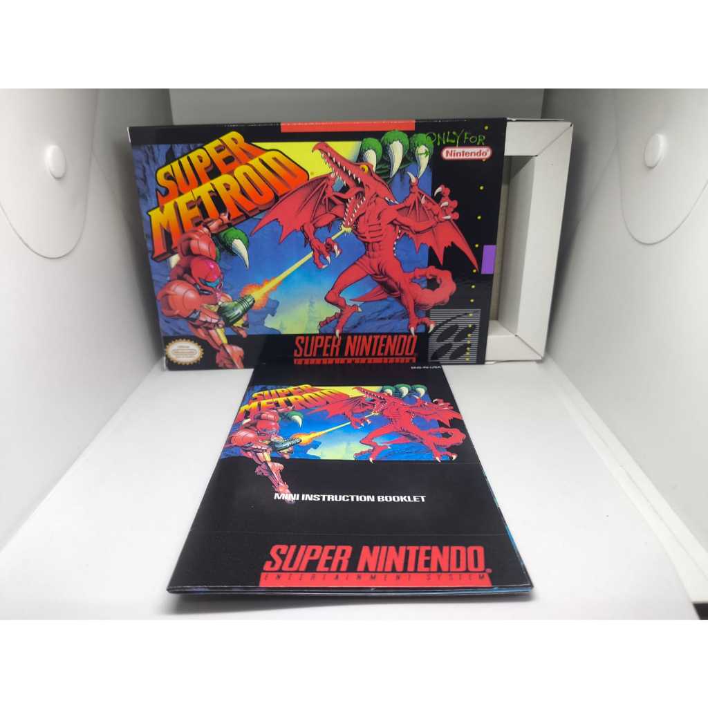 caixa com berço repro + label frente e verso do jogo de super nintendo snes super metroid