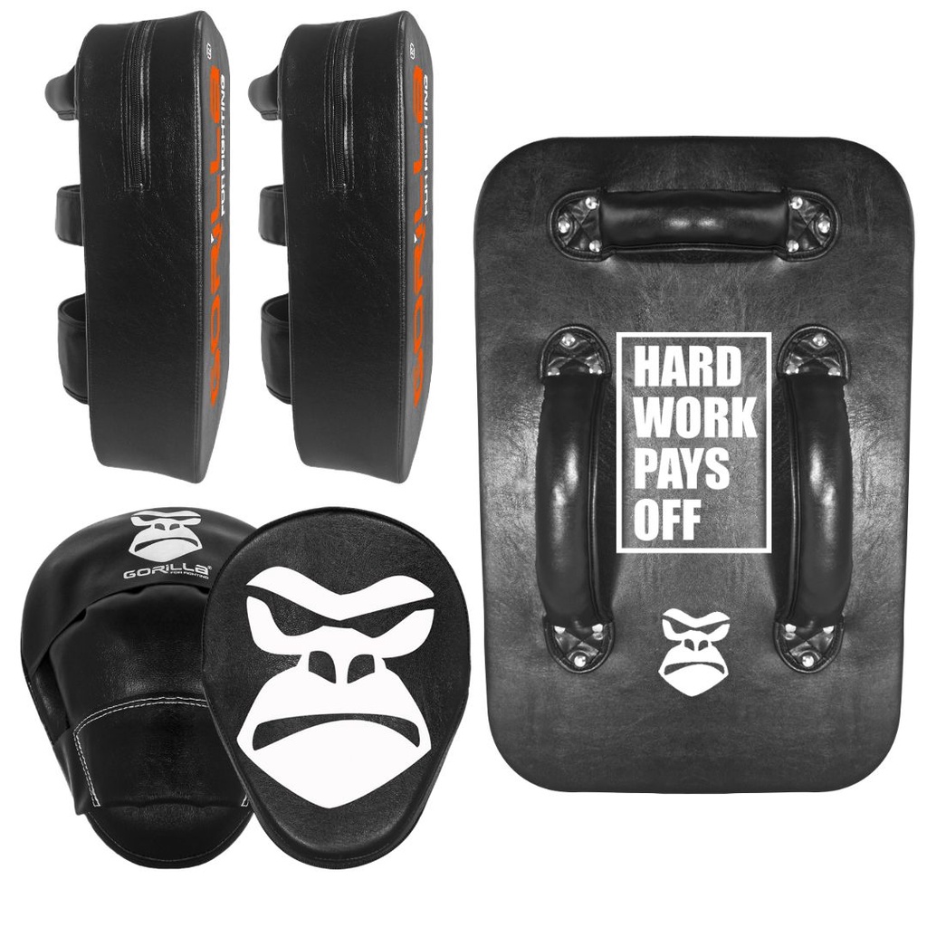 Manopla De Foco Bater Soco Boxe Box + Aparador Almofada De Pé Thai Pad Golpe Gorilla + Escudo Grande Chute Muay Thai kickboxing Arte Marciais Cor Preto - Preço Direto de Fábrica Envio Imediato Garantia Gorila Kit Profissional Preço Direto de Fábrica