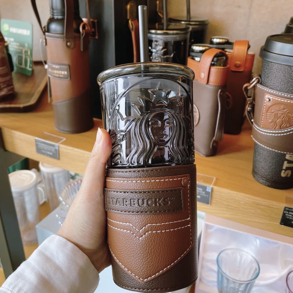Starbucks Dia Dos Pais De Verão Fresco Preto Deusa Logotipo Caixa De Couro Copo De Vidro Canudo Água Grande Capacidade 550ml