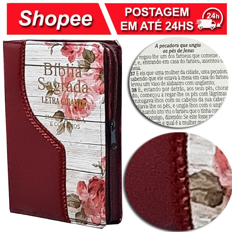 Bíblia Sagrada Letra Grande - Tamanho Grande - Capa Zíper - Harpa - Feminina - Vinho e Rosas