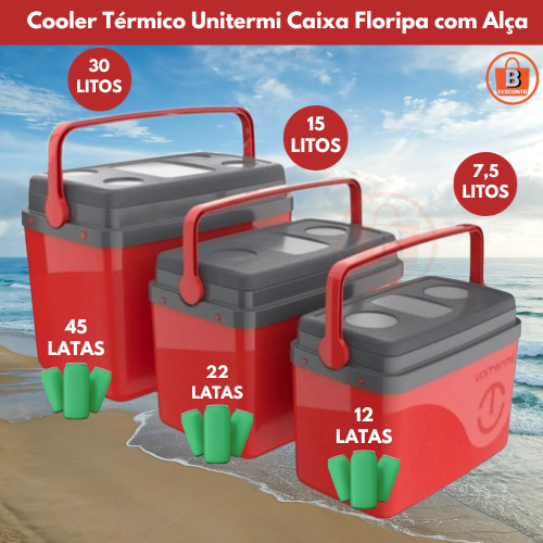 Cooler Térmico Unitermi Caixa Térmica Floripa Com Alça 30L, 15L e 7,5L Vermelha Grande Isopor Conserva 24h Bebidas e Alimentos