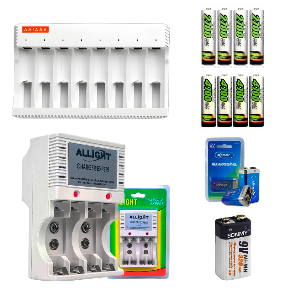 Carregador de Bateria 9V e Pilhas + 8 Pilhas Recarregaveis AA/AAA