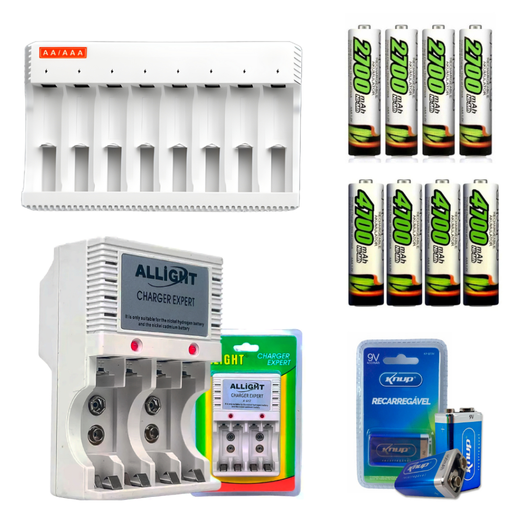 Pilhas Recarregáveis AA e AAA Bateria Recarregável 9V Carregador de Pilhas e Bateria Bivolt