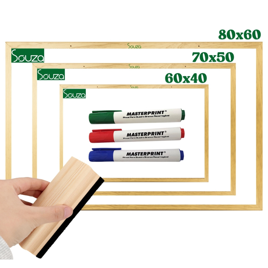 Quadro Lousa Escolar Branco Moldura em Madeira com Apagador e Marcador Souza