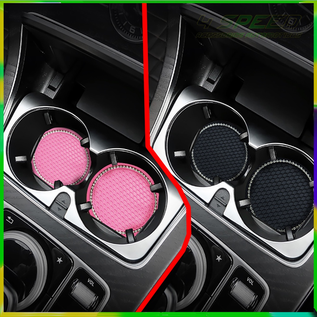 2x Porta-copos para carro emborrachado com detalhe em pérola (Preto/Rosa)