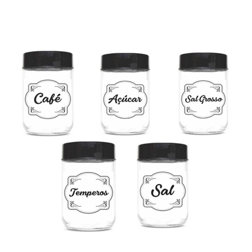 Pote Porta Condimentos 590 ML Vidro Temperos Sal Açúcar Café Com Tampa Mantimentos Com Nome Adesivo Cozinha Sal Grosso Grande Médio Pequeno Vasilha Guardar Potinho Frasco Preta