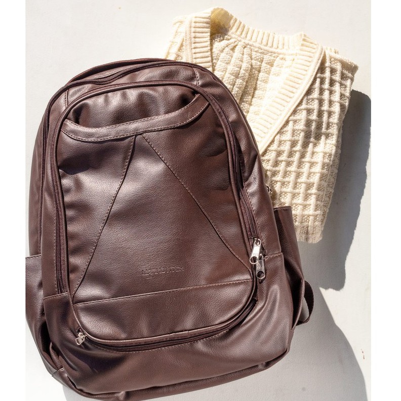 Mochila couro fino masculina grande com 1 bolso e puxador em couro