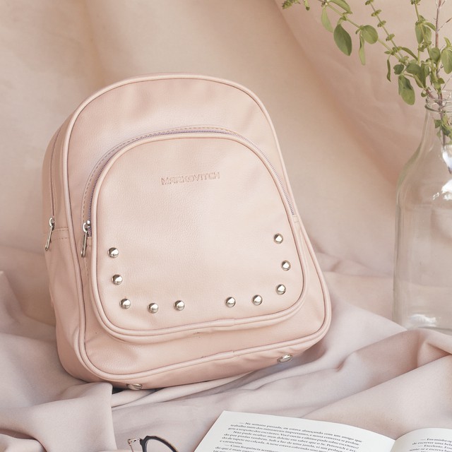 Mochila feminina casual, pequena, com bolso na frente e em couro sintético nas cores preto, nude, caramelo e marrom