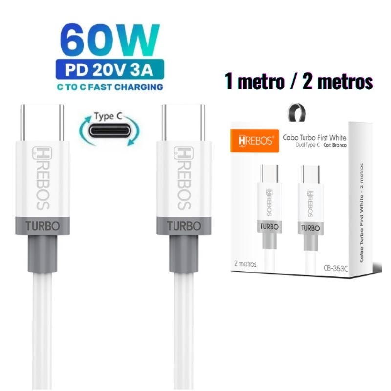 Cabo Tipo C Turbo 2 Pontas USB-C 60W 1 e 2 Metros 3.1A Carregamento Rápido