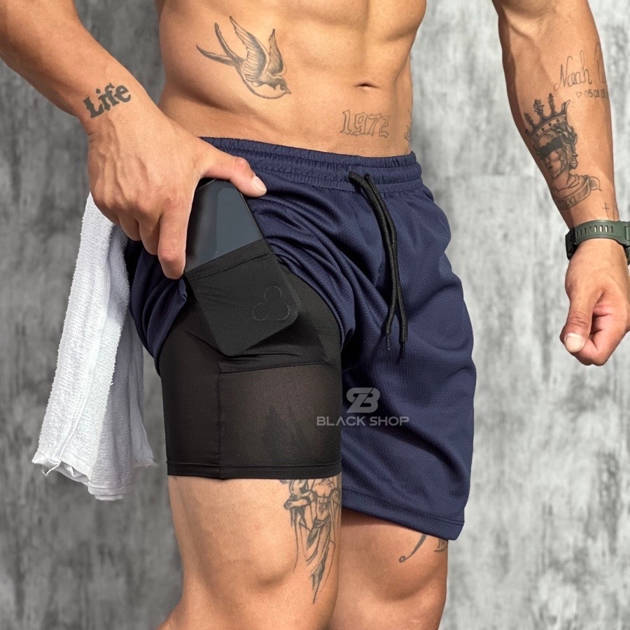 Short 2 em 1 Dry Fit Forrado Bermuda Academia Masculina Corrida Treino Com Elastano