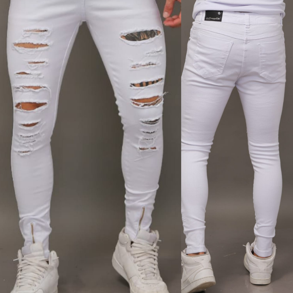 Calça Skinny Jeans Rasgado Branca Masculina Com Ziper na Perna Premium