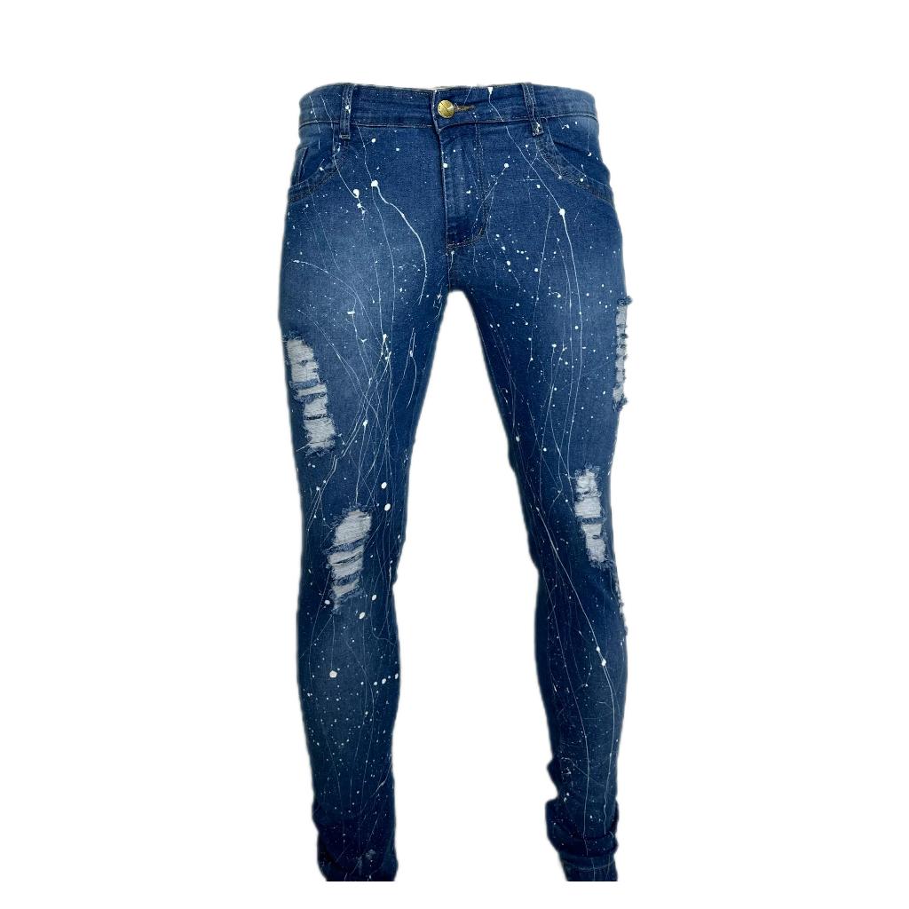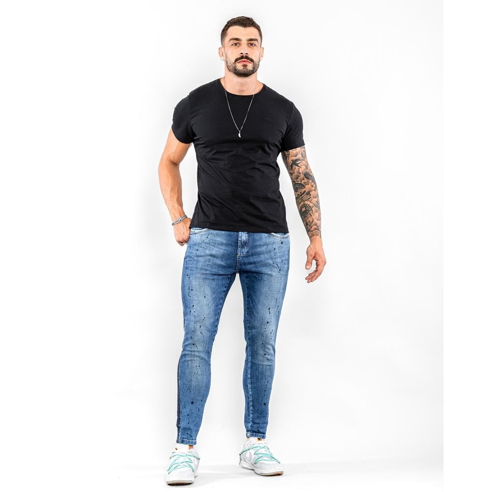 Calça Jeans Masculina Super Skinny Com Listra Na Lateral e Respingos Preto Com Lycra 21299