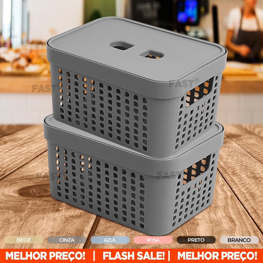 Kit 2 Cesto Organizador Rattan 2L Caixa C/ Tampa Plástico Resistente Organiza Gaveta Armário Cozinha