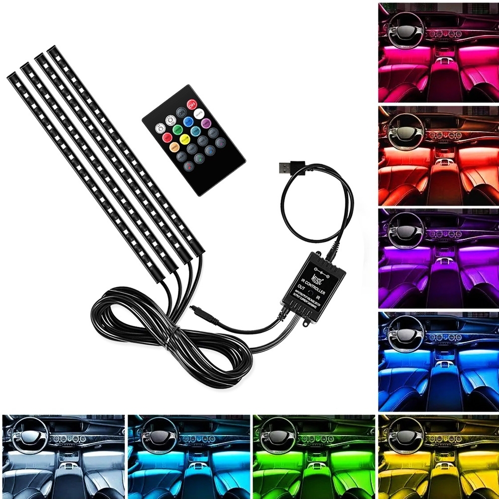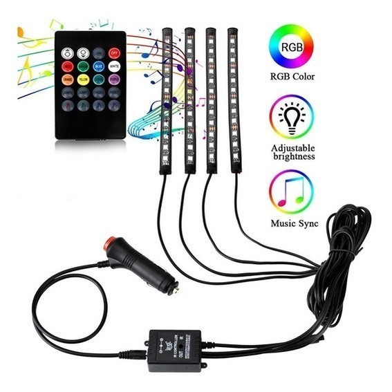 Kit Para Iluminação Interior Carro Luz Led Rgb Com Controle Sensor Rítmico 12v 4 Faixas de Luz
