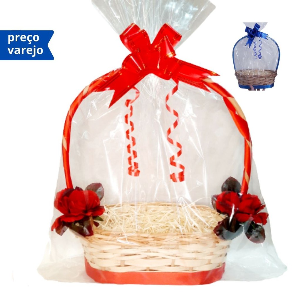 Cesta de Vime Decorada com Flores e Fita de Cetim + Saco, Laço e Palha - Para Presente de Páscoa, Namorados, Mães