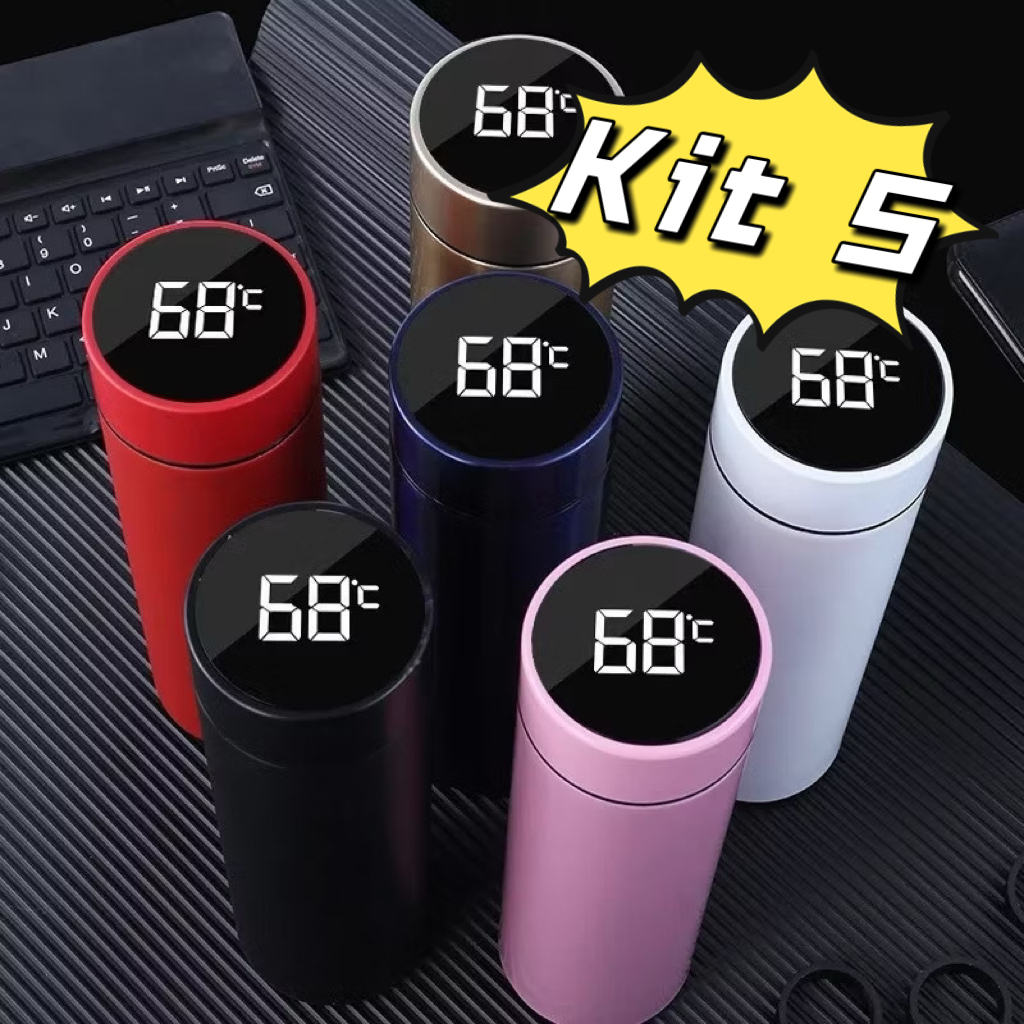 Kit 5 Garrafa Térmica Inteligente Em Aço Inox Com Termômetro Digital 500ml Led Café Água Quente Gelado