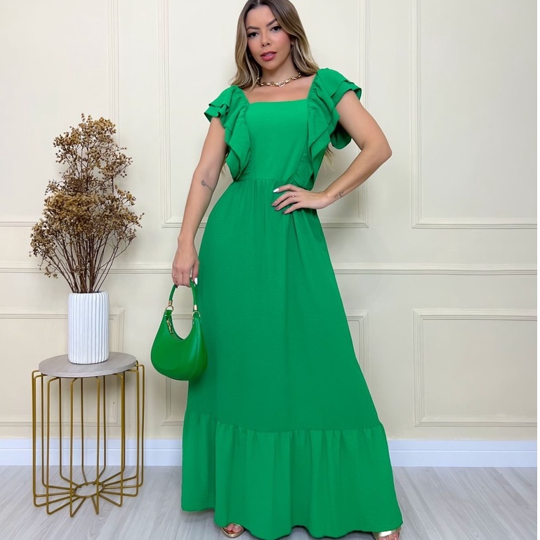 Vestido Longo Feminina Lisa Manga Babado Moda Verão 3RD SD5016
