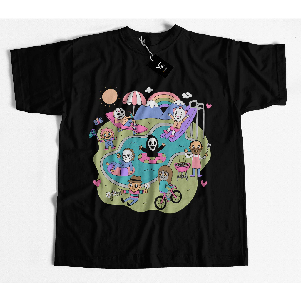 Camiseta Filmes de Terror Festa na piscina cartoon horror movies jason sexta feira 13 helloween it a coisa chuck panico massacre da serra elétrica hannibal maos de tesoura o exorcista