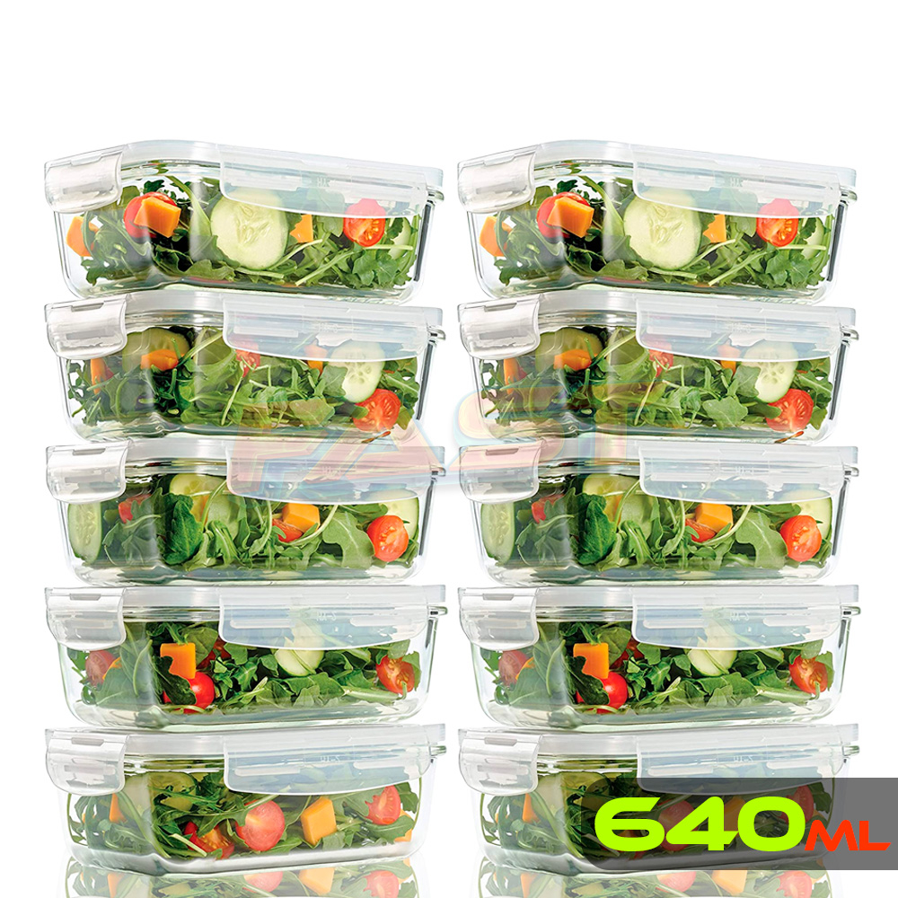 Conjunto de 10 Potes de Vidro Borossilicato Capacidade de 640 ML Com 4 Travas Hermética Vedação em Silicone Vai ao Freezer Micro-ondas e Forno Alta Resistência Produto Premium Marmita Fit Organizador de Geladeira BPA FREE