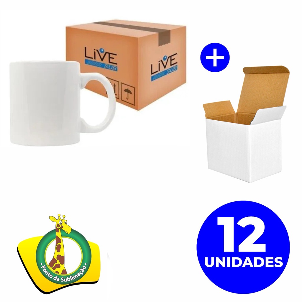 Caneca Branca de Cerâmica Live 325ml + Caixinha - 12un - Caneca Branca Para Sublimação - Caneca Porcelana - Caneca Sublimação - Arte