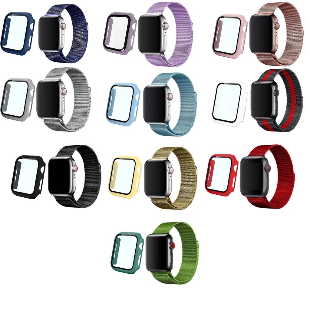 Kit Pulseira De Relógio Metal Milanesa Aço Com Capa Capinha Case Smartwatch Compatível Para Apple Watch E Iwo Bumper Vidro Temperado Super Proteção