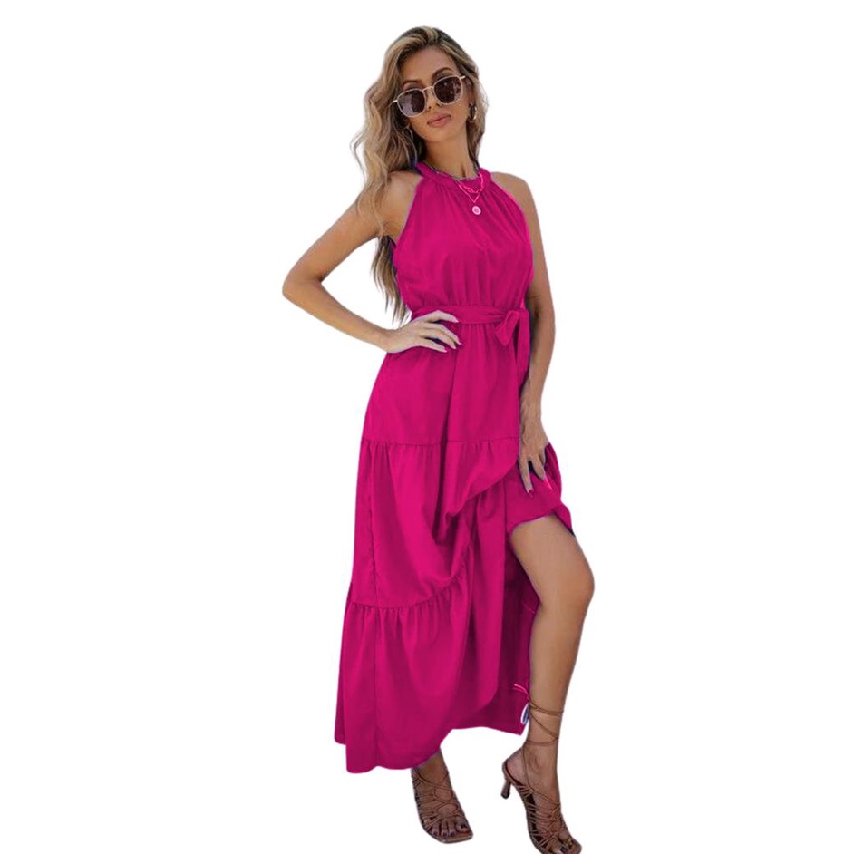 Vestido verão decotado com fenda longo feminino de alça amarração com elástico na cintura poliéster