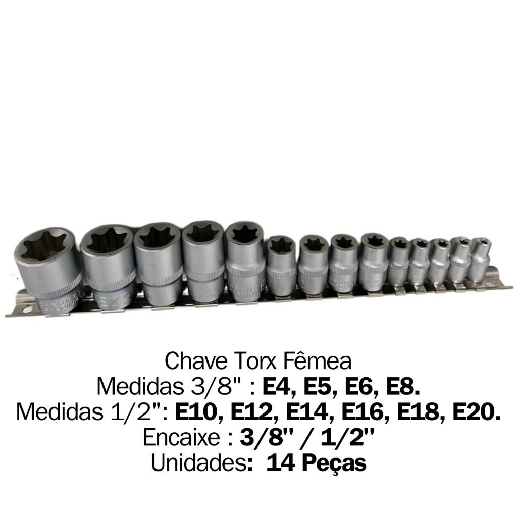 Jogo De Soquete Torx Fêmea 1/2, 3/8 E 1/4 14 Peças