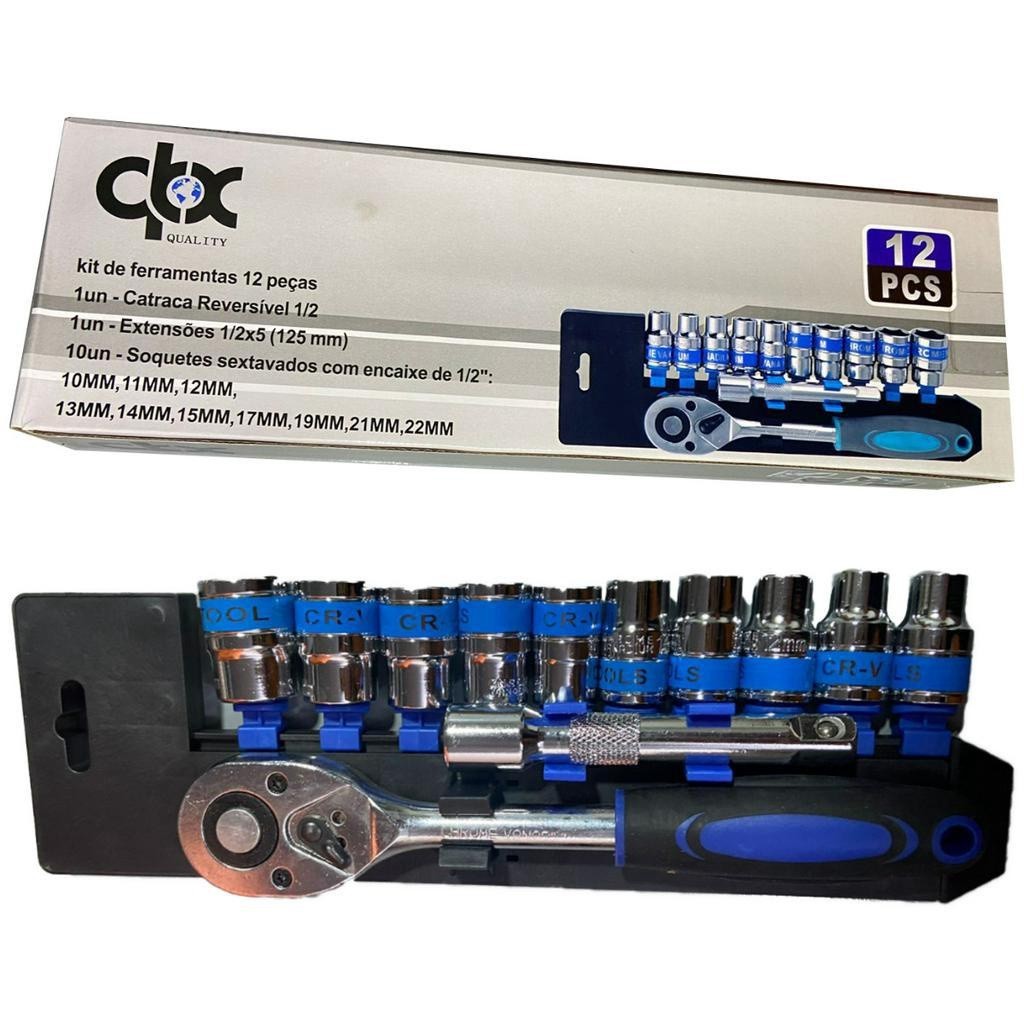 Jogo De Soquete Sextavado 1/2 Catraca 12 Peças 10 a 22mm com Extensão