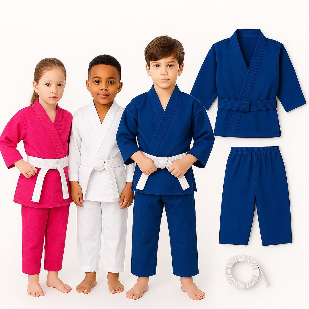 Kimono Infantil Reforçado Jiu-Jitsu Judô Infantil Reforçado Iniciante nas cores Branco, Rosa Pink e Azul Royal + Faixa Branca