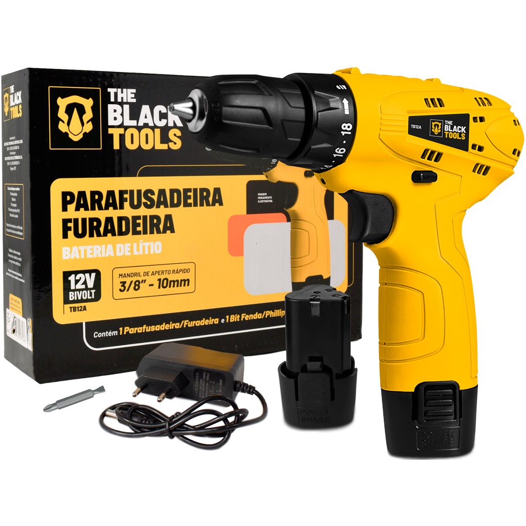 Parafusadeira E Furadeira S/ Fio Bateria 12v Bivolt 3/8 10mm Com Maleta E Acessorios The Black Tools