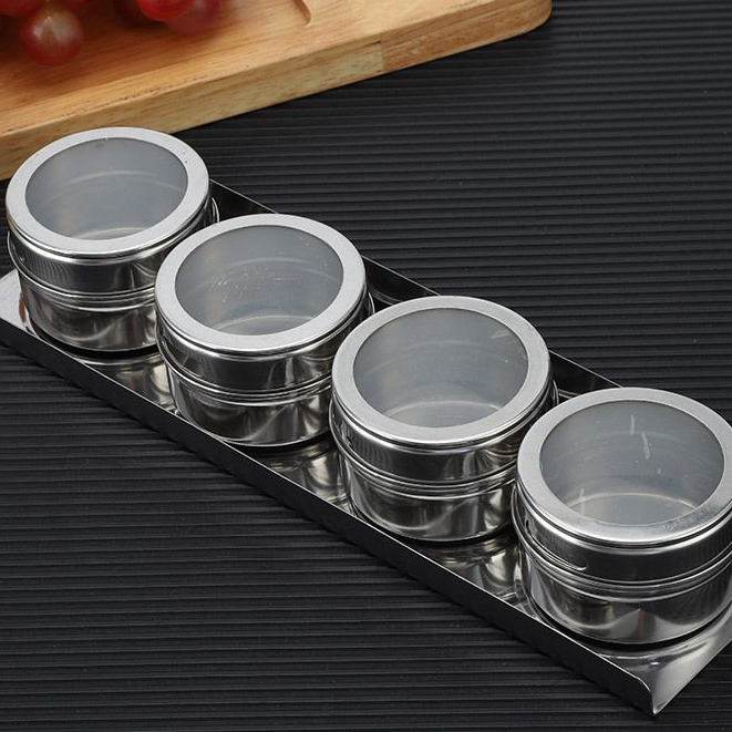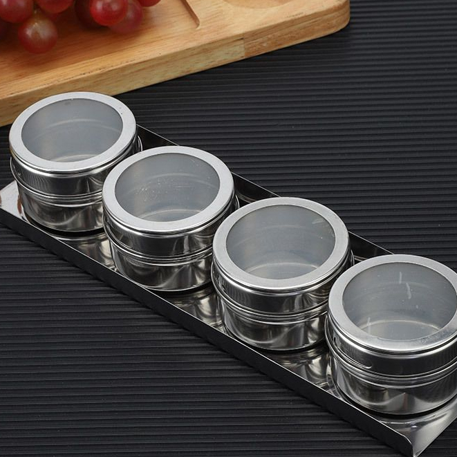 Porta Tempero Condimento 4 Potes Inox Com Base Magnética 70ml e Visor Transparente 6x4cm Com Imã Para Geladeira e Suporte