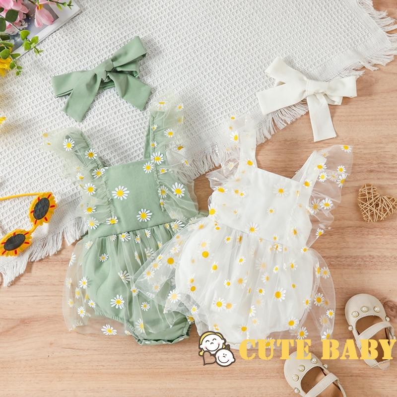 Eph-Infantil Bebê Meninas 2 Peças Verão Margarida Estampa Malha Macacão Vestido Com Faixa De Cabeça,0-12 Meses