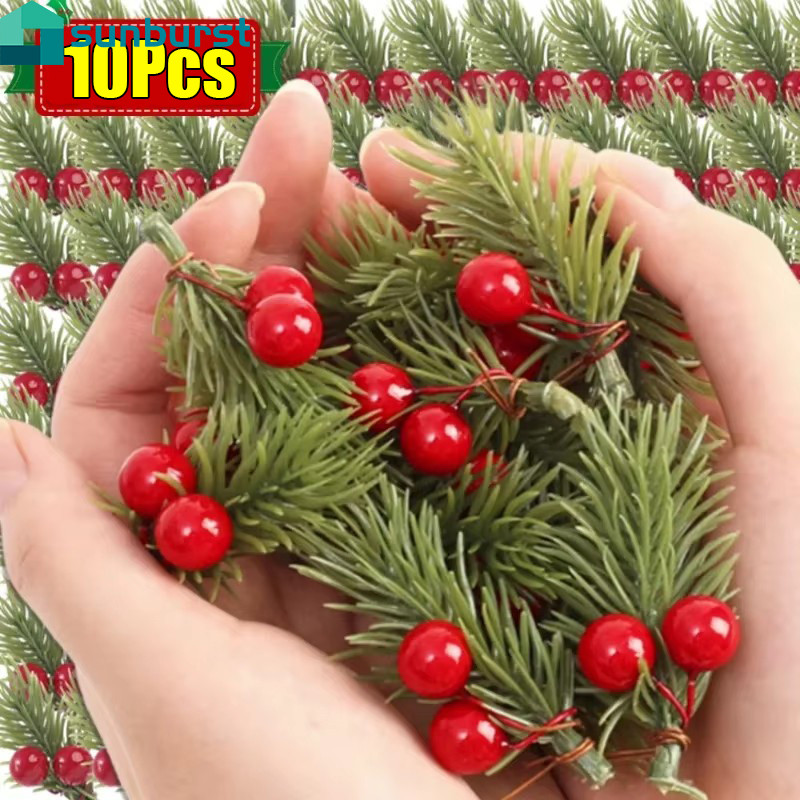 5/10 Unidades De Frutas De Agulha De Pinheiro Artificial De Natal-Hastes De Flores De Simulação Com Pinha De Neve-Pingente De Enfeites De Árvore Artesanato De Embrulho De Embalagem-Vermelho Azevinho/Douradas