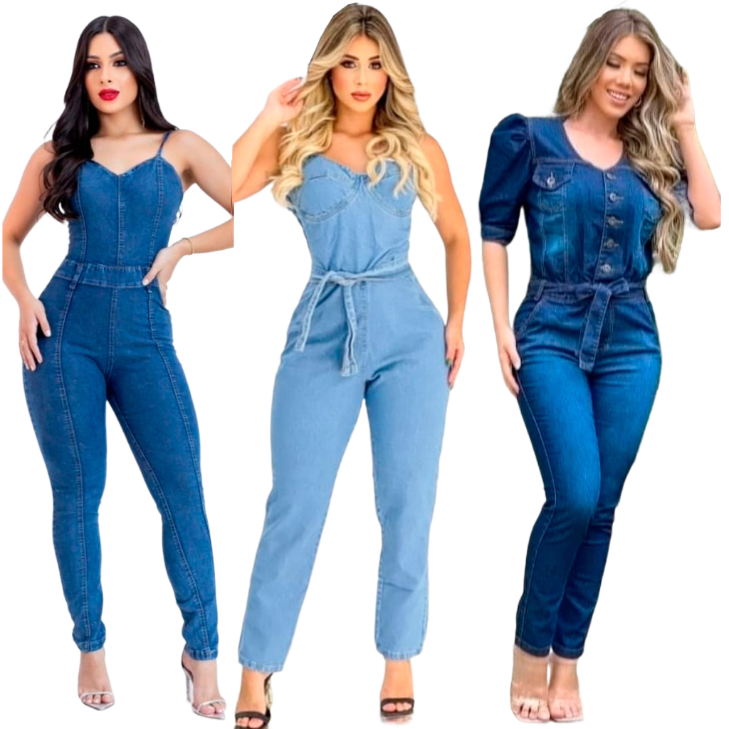 Macacão Jeans Feminino Longo Calça Com Lycra Elastano Jardineira Premium